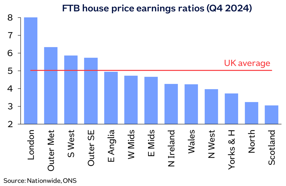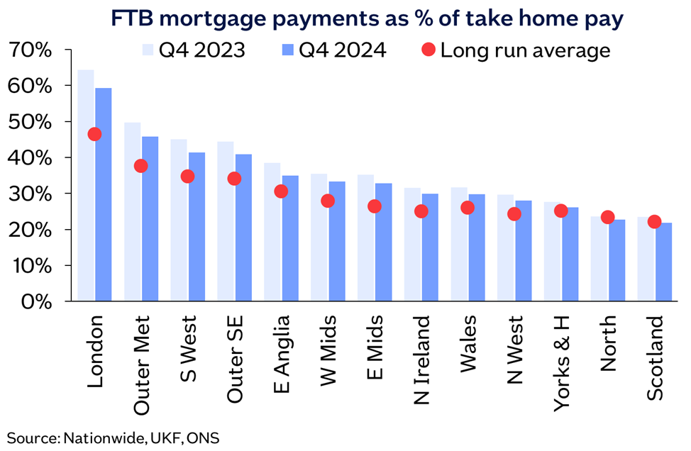 “London actually saw the largest improvement in affordability, reflecting relatively weak house price growth in 2024. Nevertheless, the capital remains the least affordable region by a significant margin (see chart above). Affordability pressures continue to be more pronounced in the South of England and East Anglia, whilst in the northern regions of England and Scotland, mortgage payments as a share of take-home pay are much closer to their long run average.