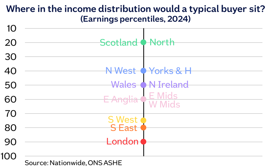 “In broad terms, the picture that emerges is that this hypothetical typical buyer is located further up the income spectrum as you go from north to south. For example, in Scotland and the North, this typical buyer would be in the 20th income percentile, while in the South West they would be in the 75th percentile and above the 90th percentile in London.