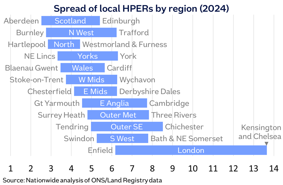 “As shown on the chart below, London continues to have the greatest gap between the most and least affordable boroughs by a considerable margin. Meanwhile, the North has the smallest difference between local authority house price earnings ratios (HPERs).