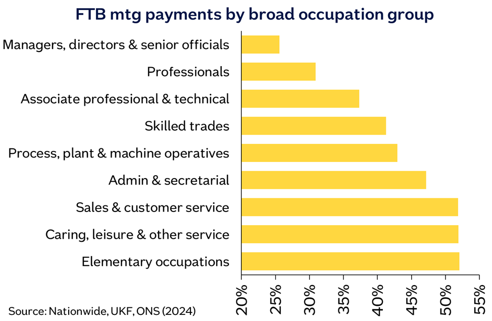 “We explored how affordability varies for people in different professions. Perhaps unsurprisingly, mortgage payments relative to take-home pay are lowest for those in managerial and professional roles, where average earnings tend to be higher.