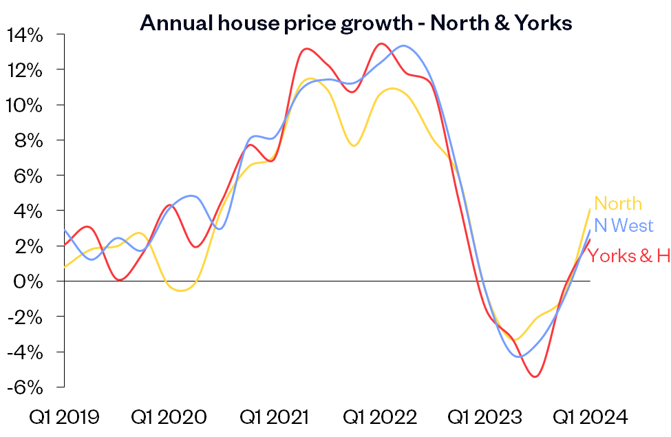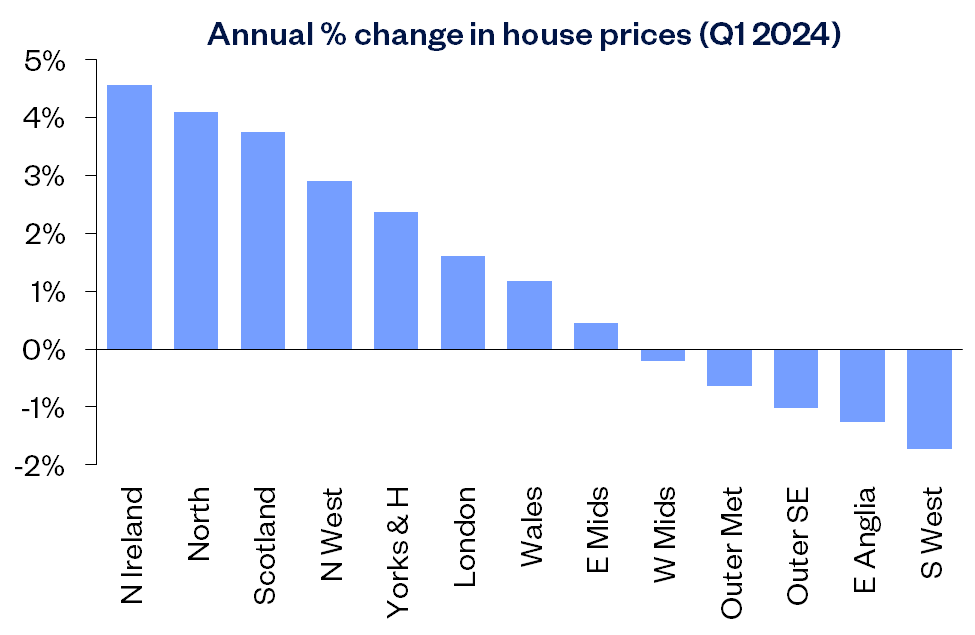 “Northern Ireland remained the best performing area, with prices up 4.6% compared with Q1 2023. The biggest improvement in terms of annual price growth was in the North, where annual price growth picked up from -0.8% in Q4 2023, to 4.1% in Q1 2024, making it the best performing English region.