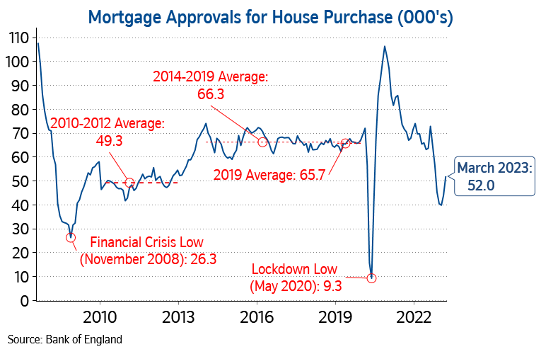 “Recent Bank of England data had shown some signs of recovery in housing market activity, although the number of mortgages approved for house purchase in March was still around 20% below pre-pandemic levels.