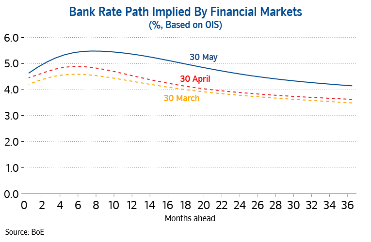 “Moreover, headwinds to the housing market look set to strengthen in the near term. While consumer price inflation did slow in April, it was a much smaller decline than most analysts had expected. As a result, investors’ expectations for the future path of Bank Rate increased noticeably in late May, suggesting it could peak at c5.5%, well above the c4.5% peak that was priced in around late March. Furthermore, rates are also projected to remain higher for longer (see chart below).