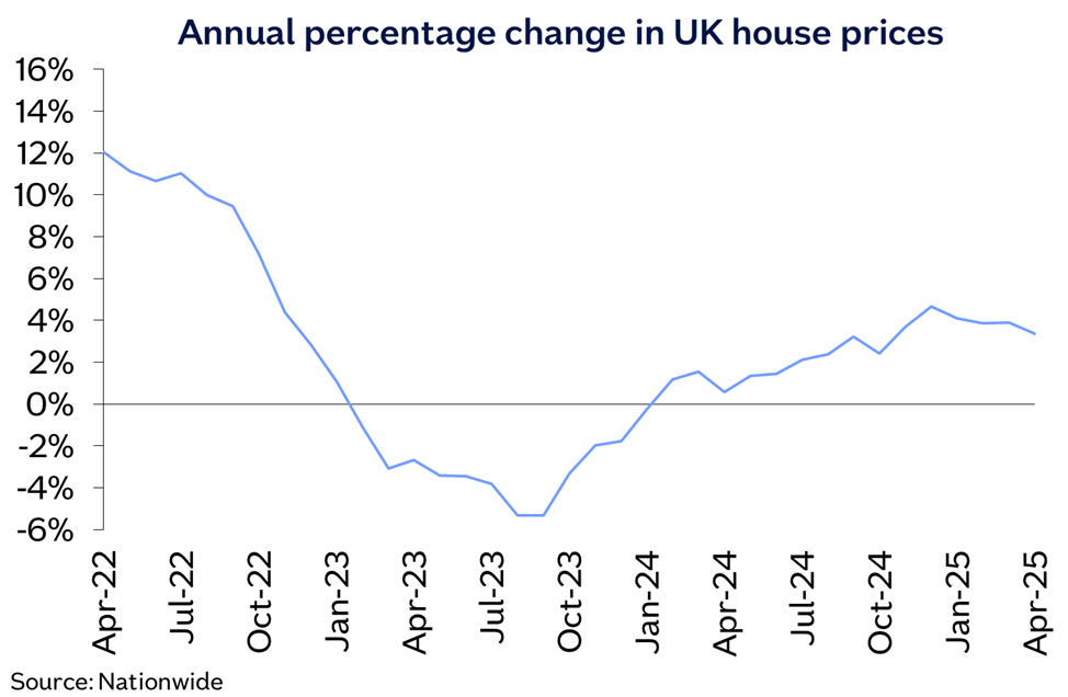 “April saw a slowing in UK house price growth to 3.4%, from 3.9% in March. House prices fell by 0.6% month on month, after taking account of seasonal effects.