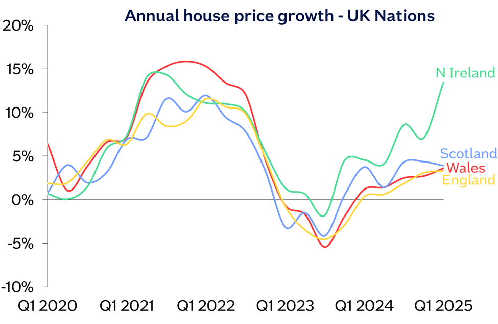 “Northern Ireland, the strongest performer, was a notable exception, with annual price growth accelerating to 13.5% more than double the pace of the next fastest outturn in Q1 and the highest recorded in the region since 2021, though similar to the robust rates of growth seen in border regions of Ireland in recent quarters. Scotland saw a 3.9% annual rise, while Wales was close behind at 3.6%.