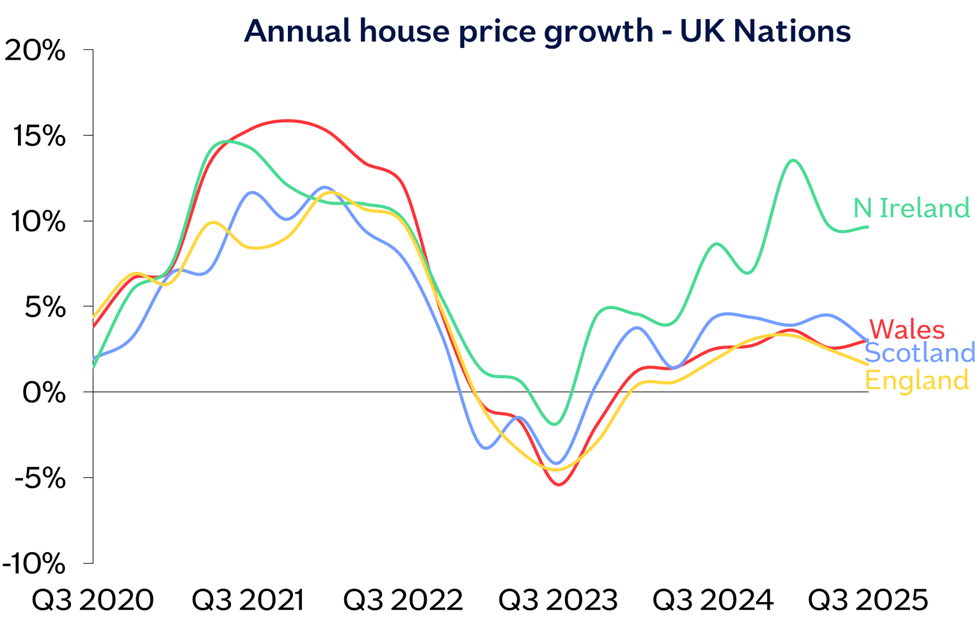 “Northern Ireland remained the strongest performer by a wide margin, with annual house price growth of 9.6% in Q3, which echoes trends seen in the border regions of Ireland in recent quarters. Wales saw a slight increase in annual house price growth to 3.0% (up from 2.6% in Q2), while growth in Scotland slowed to 2.9% (compared with 4.5% last quarter).