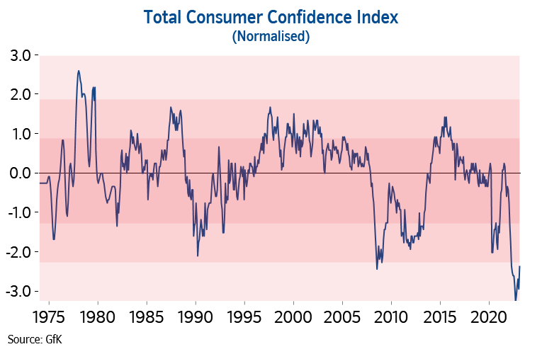 “This likely reflects the lingering impact on confidence as well as the cumulative impact of the financial pressures that have been weighing on households for some time. Indeed, inflation has continued to outpace wage growth and mortgage rates remain significantly higher than the lows recorded in 2021. Even though consumer sentiment has improved in recent months, it is still languishing at levels prevailing during the depths of the financial crisis (see chart above).