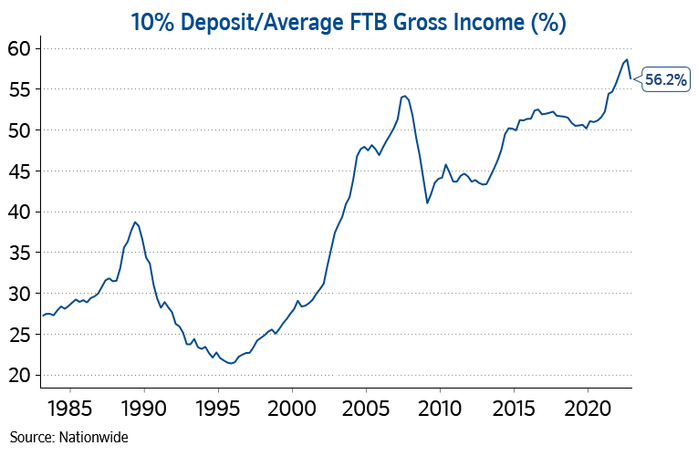 “Indeed, despite the modest fall in house prices, for a prospective first-time buyer earning the average income looking to buy the typical home, mortgage payments remain well above the long run average as a share of take-home pay. In addition, deposit requirements remain prohibitively high for many and saving for a deposit remains a struggle given the rising cost of living, especially for those in the private rented sector, where rents have been rising strongly.