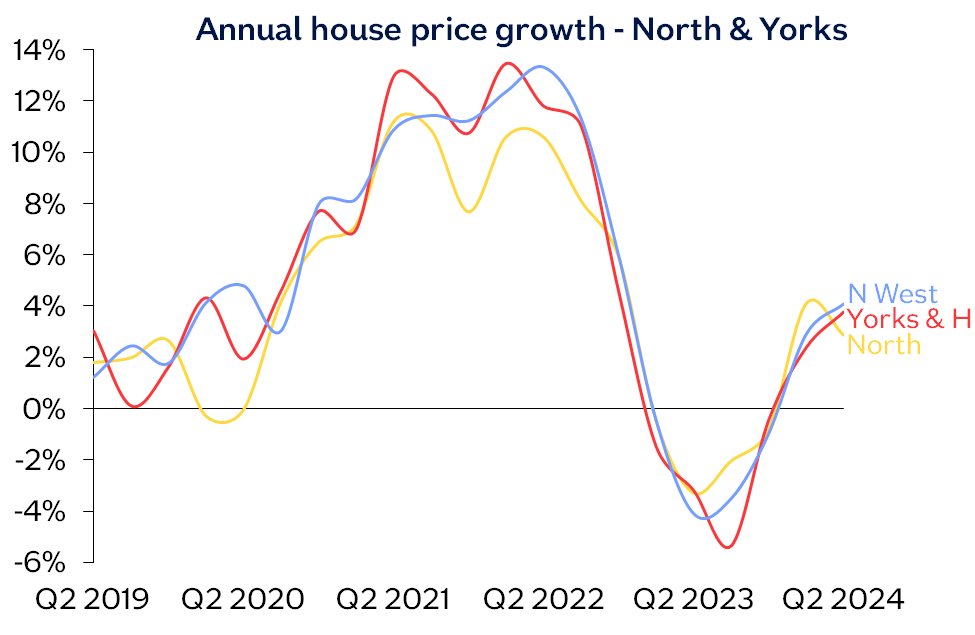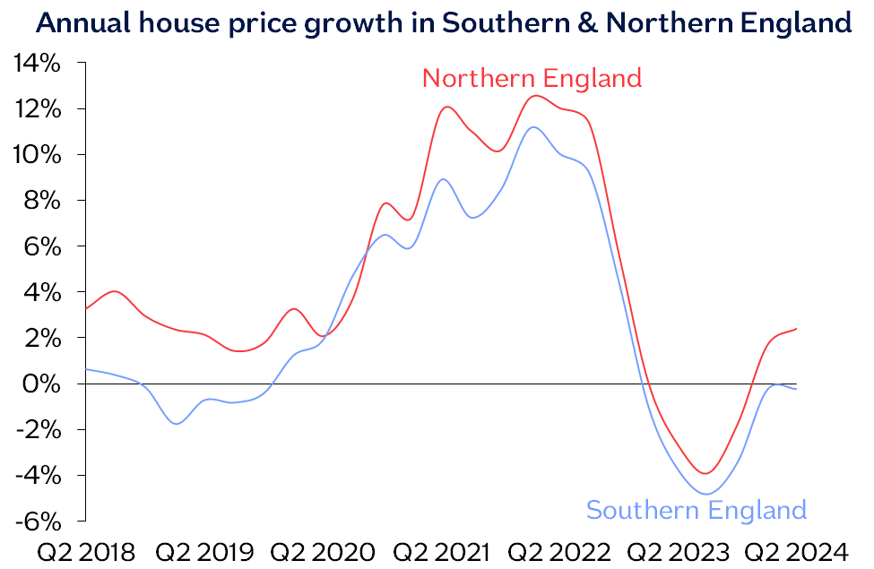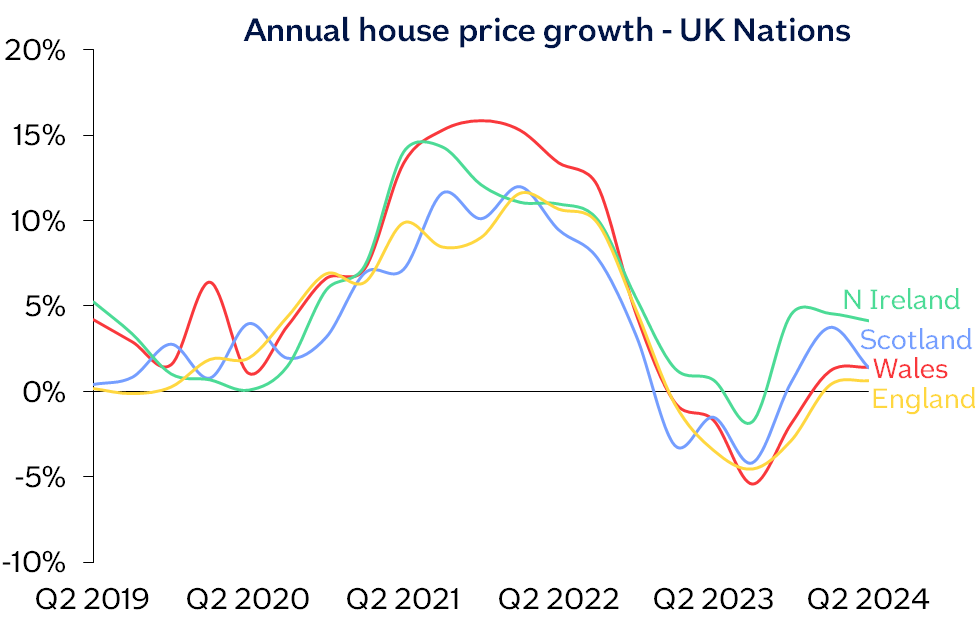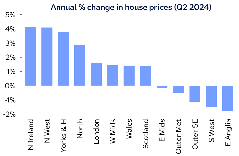 “Northern Ireland remained the best performing area, with prices up 4.1% compared with Q2 2023. Across England overall, prices were up 0.6% compared with Q2 2023, while Wales and Scotland both saw a 1.4% year-on-year rise. Northern England (comprising North, North West, Yorkshire & The Humber, East Midlands and West Midlands), continued to outperform southern England, with prices up 2.4% year-on-year.