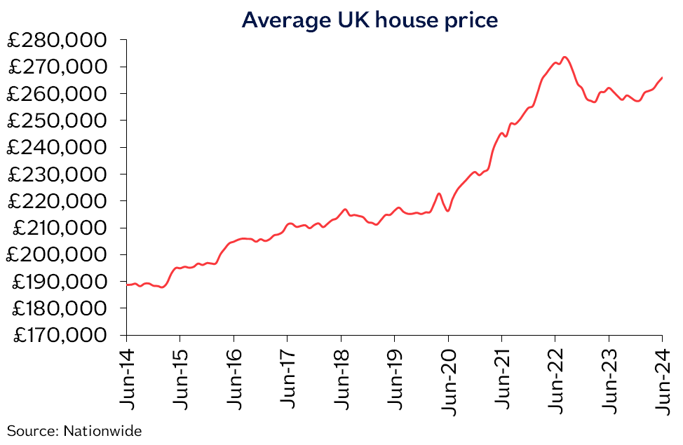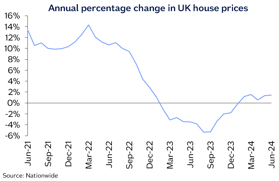 “UK house prices edged up by 0.2% in June, after taking account of seasonal effects. This resulted in the annual rate of growth rising from 1.3% in May to 1.5% in June, leaving prices around 3% below the all-time high recorded in the summer of 2022.