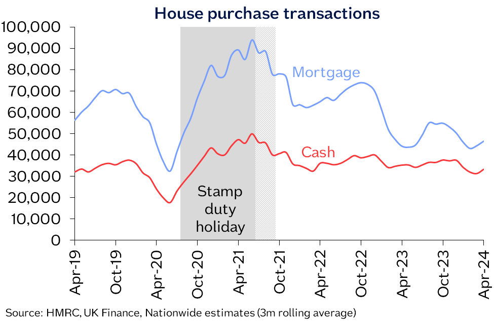“Housing market activity has been broadly flat over the last year, with the total number of transactions down by around 15% compared with 2019 levels. Transactions involving a mortgage are down even more (nearly 25%), reflecting the impact of higher borrowing costs. By contrast, the volume of cash transactions is actually around 5% above pre-pandemic levels.
