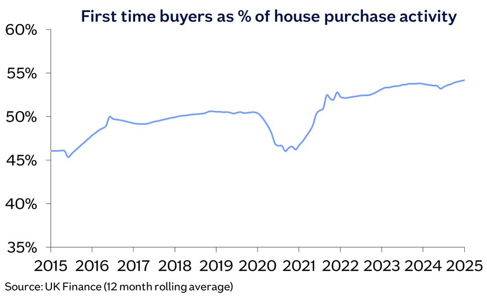 Our recent special report highlighted that affordability constraints have eased over the past year, thanks to earnings growth outpacing house price growth and also a steady decline in mortgage rates. This has helped underpin buyer demand, with first-time buyer activity over the last year continuing to edge higher as a share of house purchases.