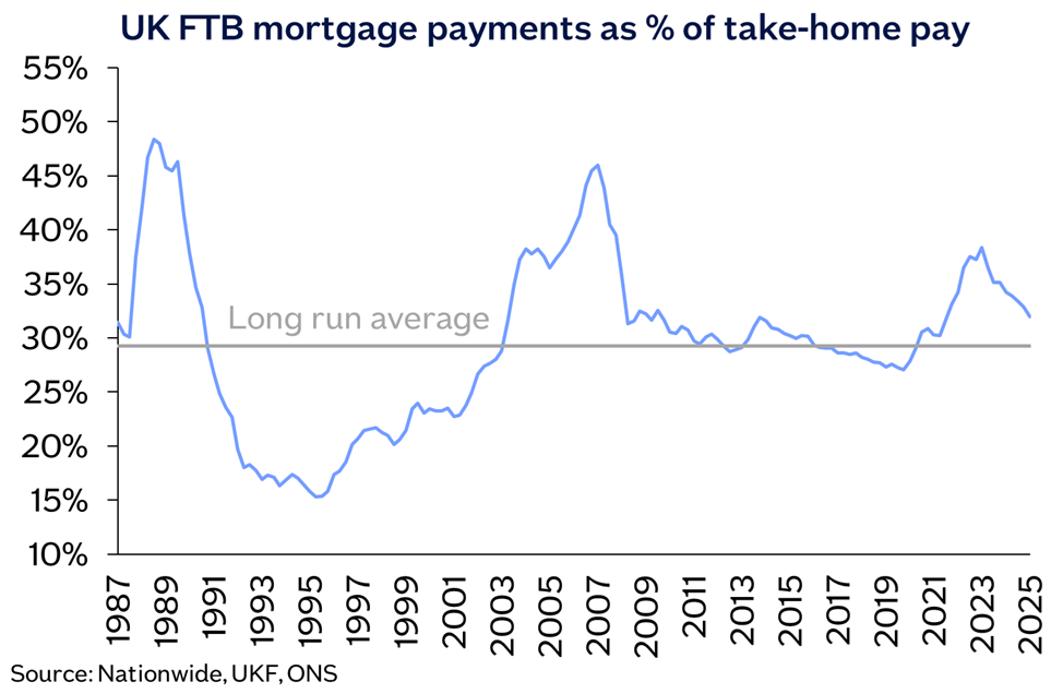 “Our main affordability benchmark shows that a prospective buyer earning the average UK income and buying a typical first-time buyer property with a 20% deposit would have a monthly mortgage payment equivalent to 32% of their take-home pay – slightly above the long-run average of 30% and well below the recent high of 38% recorded in 2023 (as shown in the chart below).