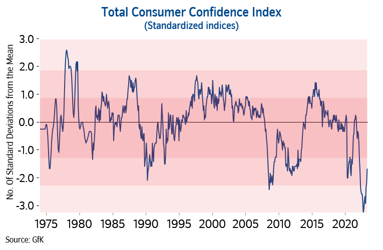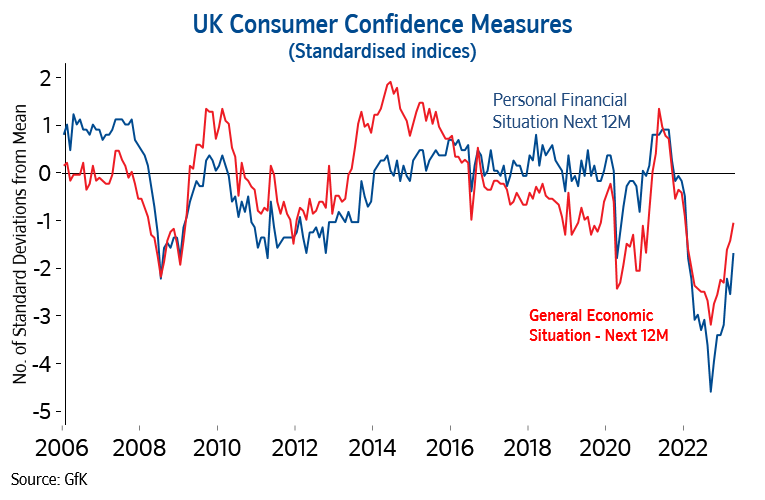 “This also chimes with the recent shifts in consumer sentiment. While confidence remains subdued by historic standards (as shown in the chart below), people’s views of their own financial position over the next twelve months, and general economic conditions in the year ahead, have both improved markedly in recent months. If inflation falls sharply in the second half of the year, as most analysts expect, this would likely further bolster sentiment, especially if labour market conditions remain strong.