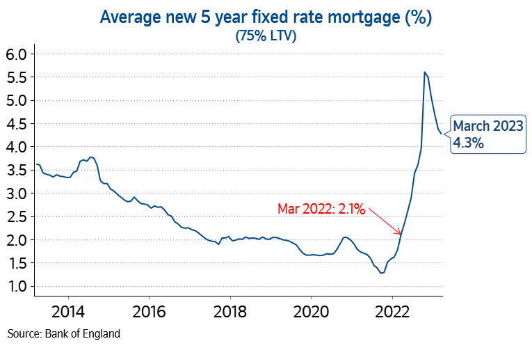 “This, in turn, would also be likely to support a modest recovery in housing market activity. But any upturn is likely to remain fairly pedestrian, as it will take time for household finances to recover, since average earnings have been failing to keep pace with inflation, and by a wide margin over the last few years. Mortgage interest rates are also likely to act as a headwind. While they are well below the highs seen in the wake of the mini-Budget last year, rates are still more than double the level prevailing a year ago (see chart below).