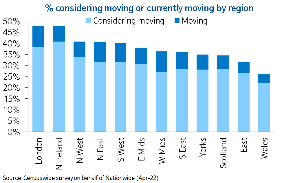 “The survey results suggest that shifts in housing preferences as a result of the pandemic are continuing to support housing market activity, though to less of an extent than at this time last year. For example, around a quarter (24%) of those moving or considering a move said that this was to move to a larger property (a similar outturn to April 2021), and for most age cohorts a majority are still looking to move to less urban environments.