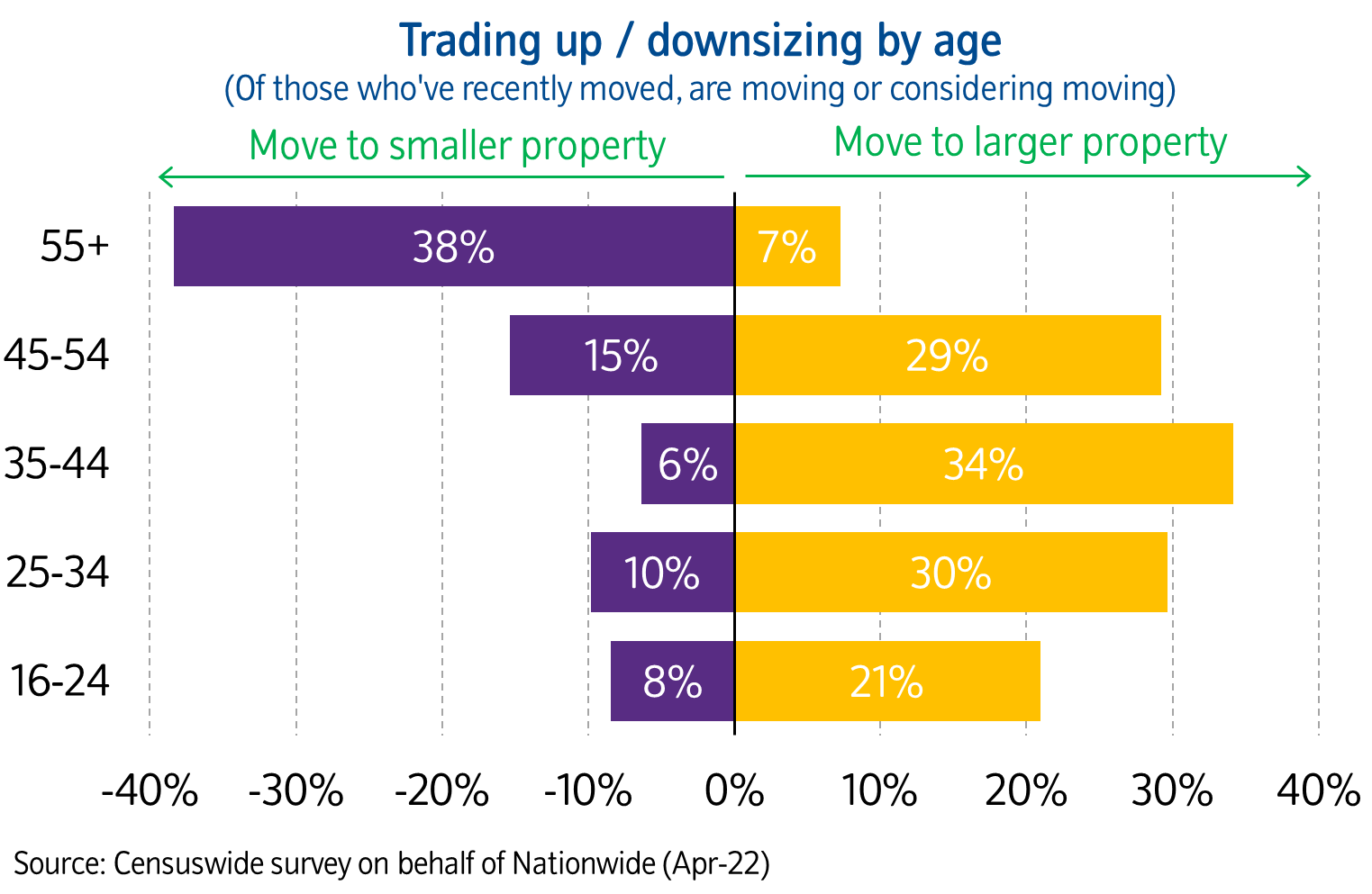 “For most movers and potential movers, the majority of those surveyed are looking to trade up – the exception being amongst those aged 55 and above, where nearly 40% are looking to move to a smaller property compared to just 7% looking to move to a larger property.