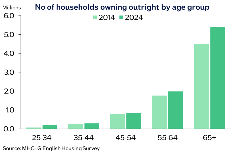 “The number of households in England owning their homes outright has increased by 1.3 million over the past ten years to reach 8.7 million. This reflects demographic developments, in particular a rise in the number of older households (aged 65+), where the number owning outright has increased from 4.5 million to 5.4 million over the last decade.”