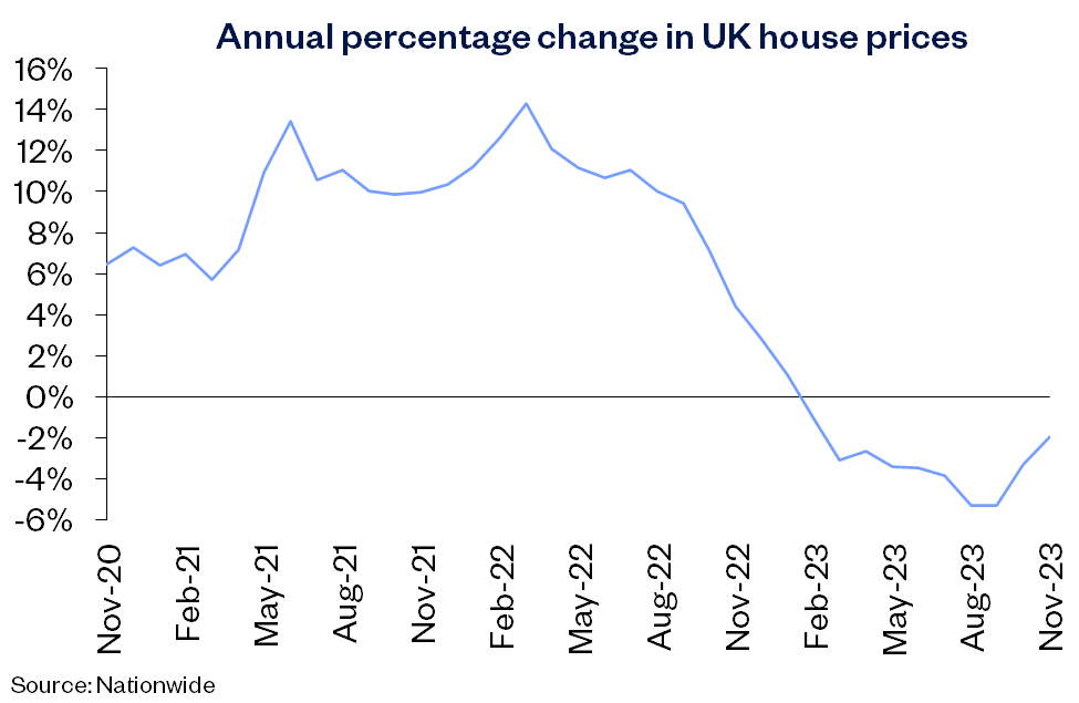 “UK house prices rose by 0.2% in November, after taking account of seasonal effects. This was the third successive monthly increase and resulted in an improvement in the annual rate of house price growth from -3.3% in October, to -2.0%. While this remains weak, it is the strongest outturn for nine months.
