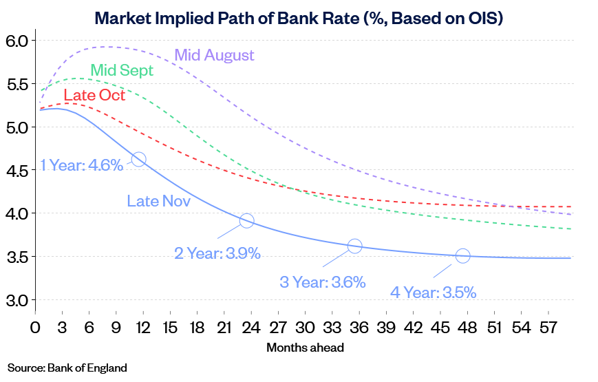 “In mid-August, investors had expected the Bank of England to raise rates to a peak of around 6% and lower them only modestly (to c.4%) over the next five years. By the end of November, this had shifted to a view that rates have now peaked (at 5.25%) and that they will be lowered to around 3.5% in the years ahead.