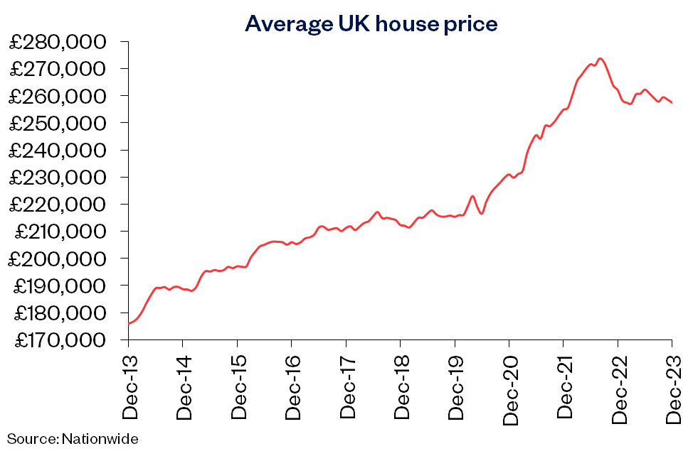 “UK house prices ended 2023 down 1.8% compared with December 2022, leaving them almost 4.5% below the all-time high recorded in late summer 2022. Prices were flat compared with November, after taking account of seasonal effects.