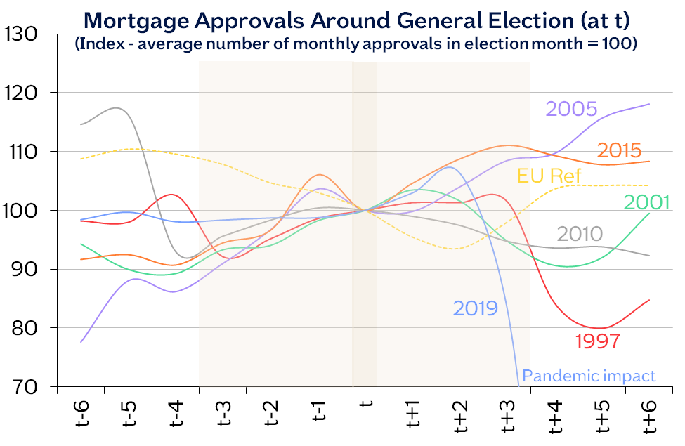 “We also examined how activity, in particular house purchase mortgage approvals, responded to past UK elections (see chart below). Here the picture is less clear but again there doesn’t seem to be any tangible impact in the three months either side of a general election.