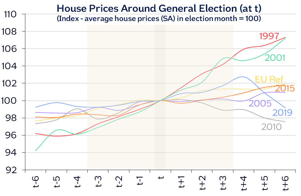 “In the chart we have indexed average house prices so they equal 100 in the election months in each of the years shown. We can then compare house price movements in the six months leading up to each election (t-6 to t-1) and following each vote (t+1 to t+6).