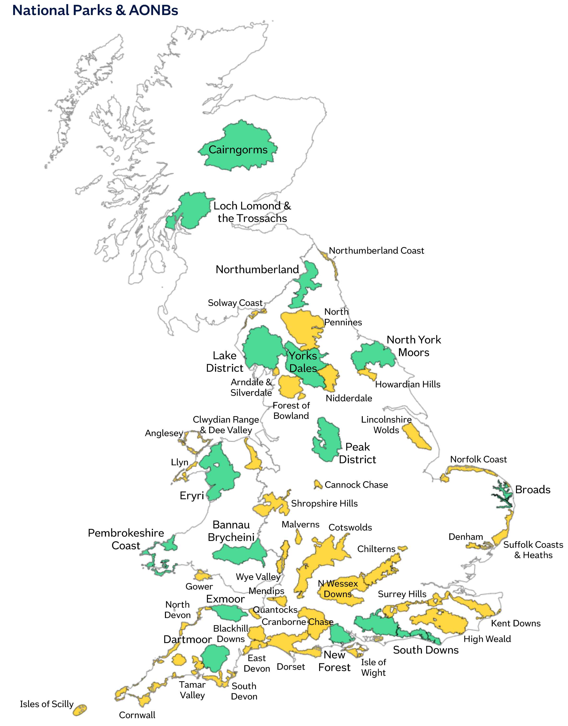 “The Areas of Outstanding Natural Beauty (AONBs), also known as National Landscapes, in England and Wales have been designated for conservation due to their significant landscape value. They vary greater in terms of size, type and use of land. AONBs cover 15% of England’s land area and are home to over one million people.