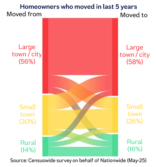 “In our latest housing market survey1, we focused on homeowners who have moved in the last five years. Our findings indicate that the majority (63%) of house moves were within the same type of area, with the biggest flow being within large towns or cities. Around 9% of moves were from towns / cities to rural areas (villages or hamlets)2, although this was partially offset by 7% who moved from rural to more urban areas(3).