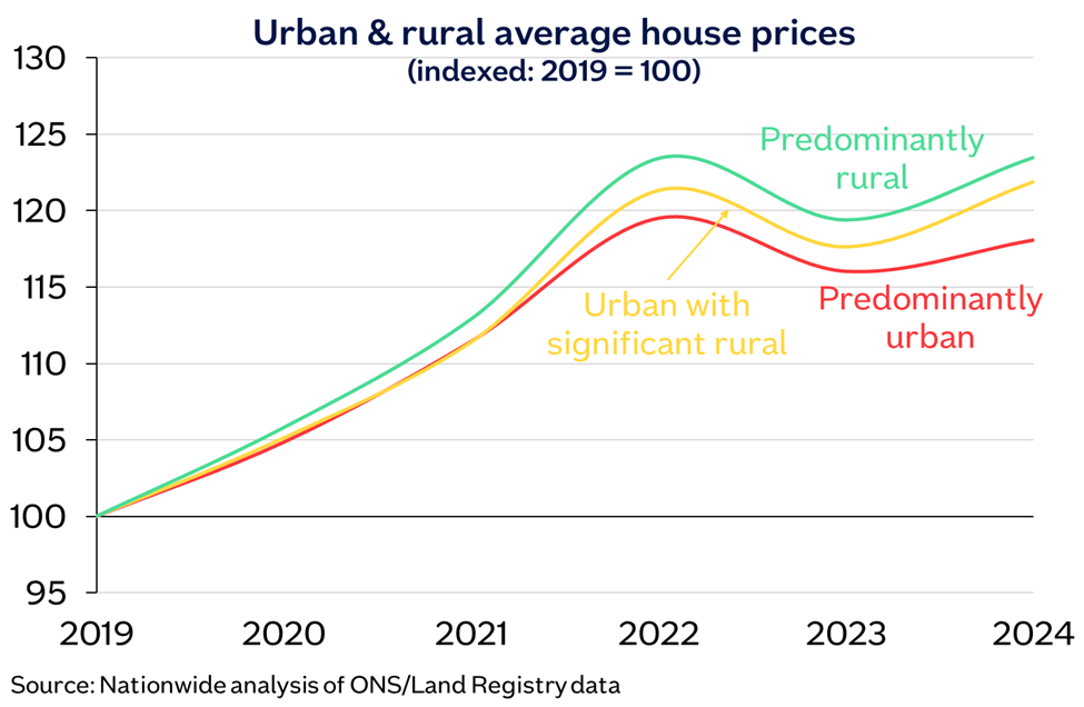 “Amongst those buying in rural locations, 41% of those surveyed bought a detached house, with a further 29% buying a semi-detached. But it is actually rural terraced properties that have seen the strongest price growth between December 2019 and December 2024, with average prices increasing by 25%. (Note that due to data availability, these figures exclude Scottish local authorities).