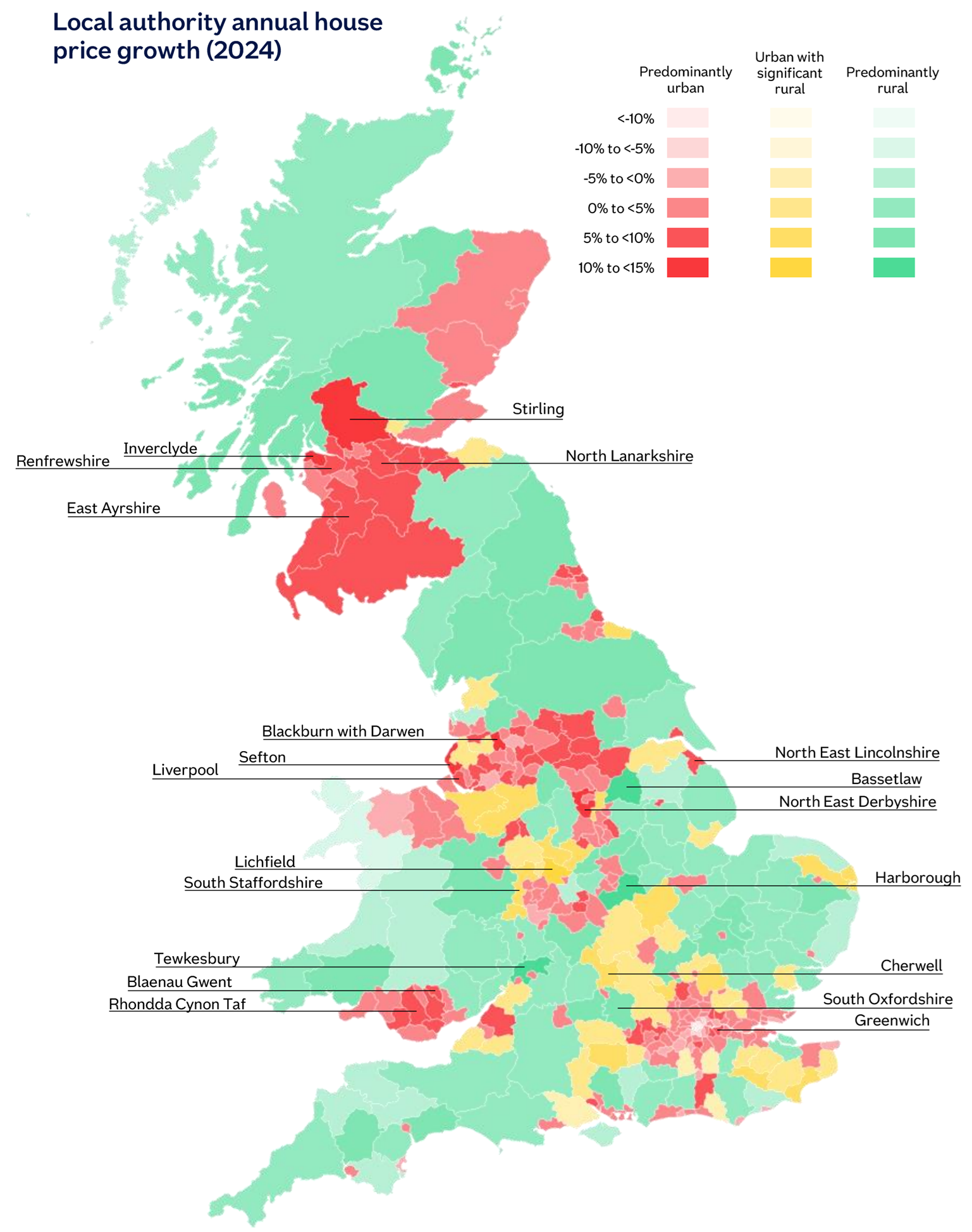 “The tables on the following page show the top performing local authorities in each region in terms of annual house price growth in 2024 split by rural and urban.”