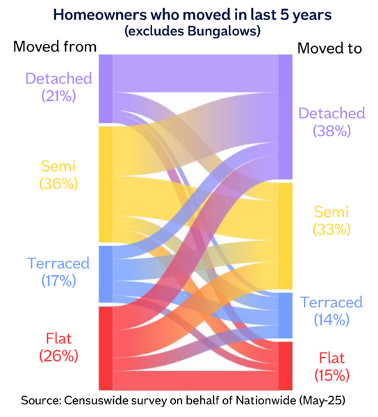 “Indeed, a third of survey respondents (33%) purchased a detached property, with just 15% buying a flat. Looking at the flows between property types, it appears the majority of home movers ‘traded up’ (see chart below).