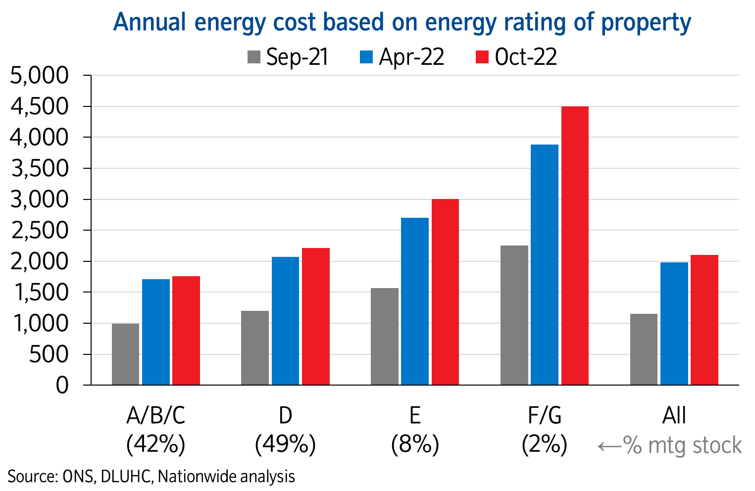 “Typical bills for D-rated properties (the most common type) are set to rise to £2,600 a year. Those in E-rated properties will be paying around £120 a month more than last winter. However, those living in the least efficient properties (rated F-G) will see average bills rise to c.£4,500, an extra £185 a month compared with a year ago, though these properties make up a small proportion (c.2%) of the stock of housing with a mortgage.
