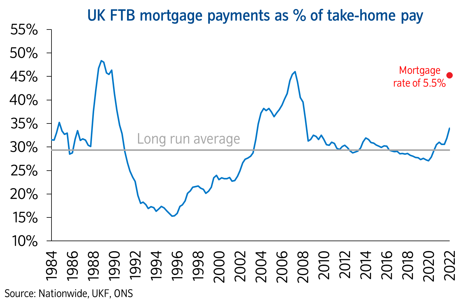 “For example, the increase in mortgage rates meant that a prospective first-time buyer (FTB) earning the average wage and looking to buy a typical FTB home with a 20% deposit would see their monthly mortgage payment rise from c.34% of take-home pay to c.45%, based on an average mortgage rate of 5.5%. This is similar to the ratio prevailing before the financial crisis.