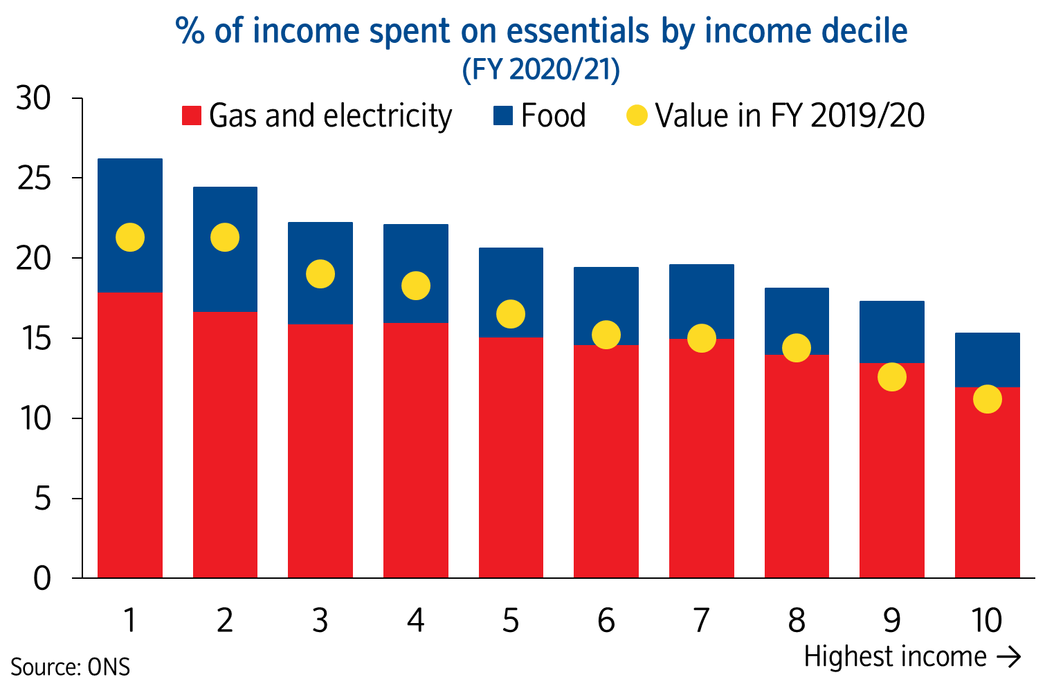 “The cost-of-living crisis is set to disproportionately affect lower income households as they spend a higher proportion of their income on essentials (food, gas and electricity). Lower income households are also much less likely to have accumulated savings, so they will find it more difficult to cover the increase in these costs.