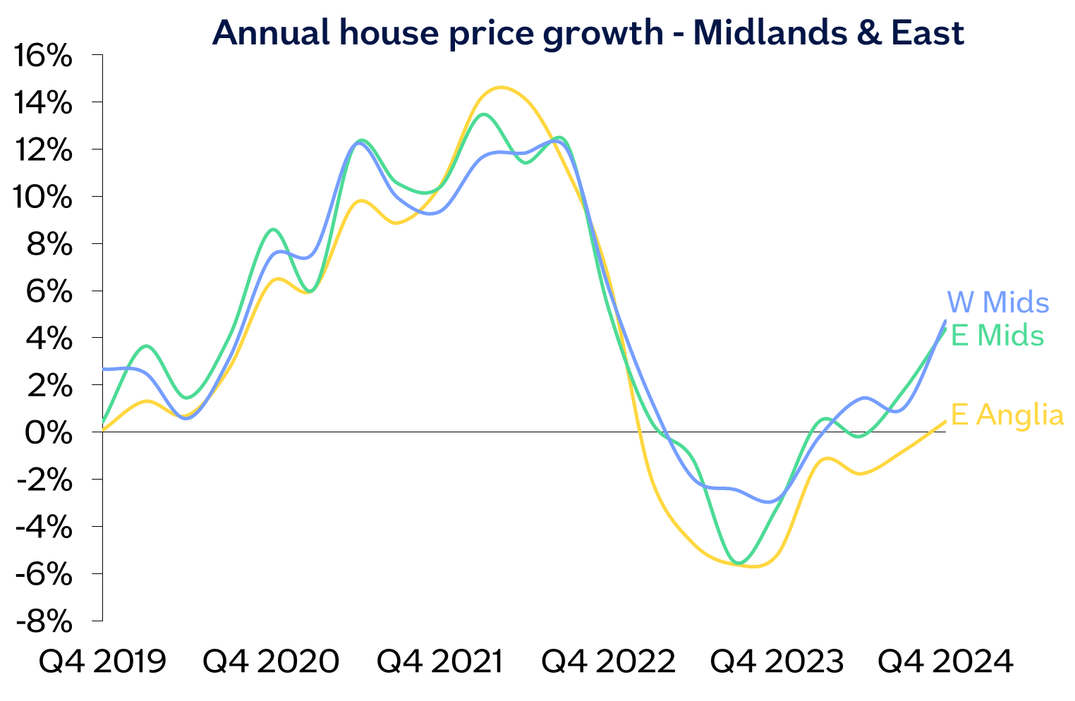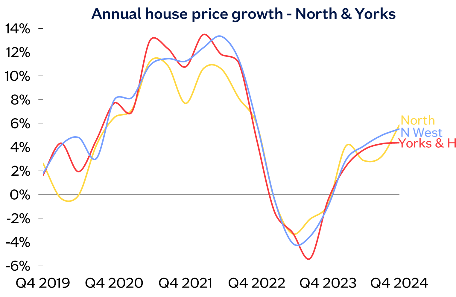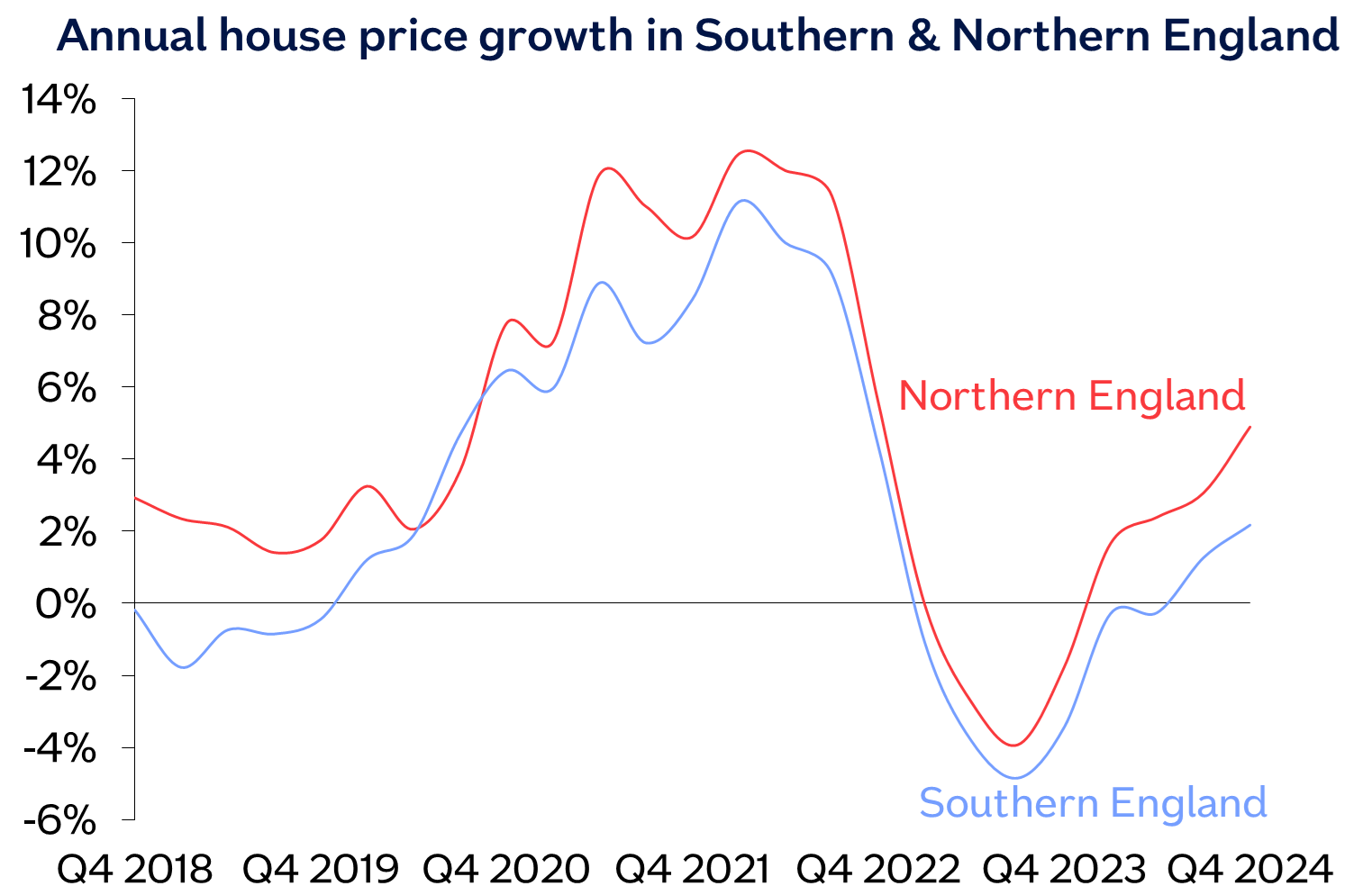 “Across England overall, prices were up 3.1%, compared with Q4 2024. There was a clear north-south divide in house price performance in 2024 as Northern England (comprising North, North West, Yorkshire & The Humber, East Midlands and West Midlands) continued to outperform southern England, with prices up 4.9% year on year. The North was the best performing English region, with prices up 5.9% year on year.