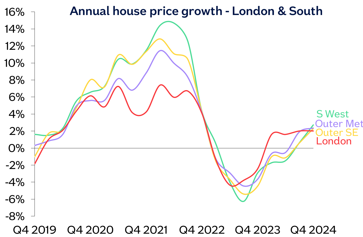“Southern England (South West, Outer South East, Outer Metropolitan, London and East Anglia) saw a 2.2% year-on-year rise. The South West was the best performing southern region with annual price growth of 2.7%. East Anglia was the weakest performing UK region in 2024, with a modest 0.5% annual increase.