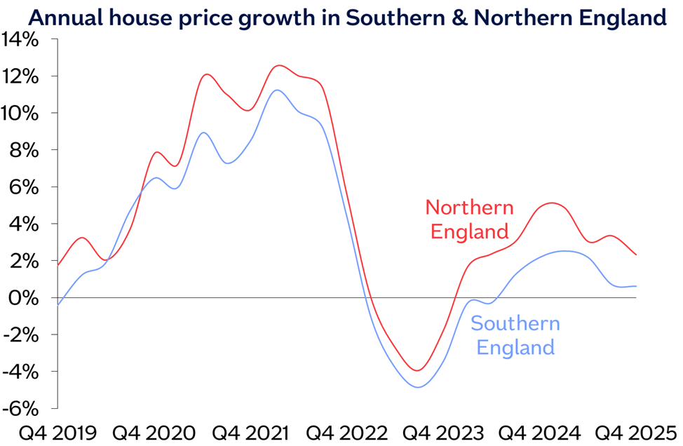 “England saw a further slowing in annual house price growth to 0.9%, from 1.2% in Q4. Average prices in Northern England (comprising North, North West, Yorkshire & The Humber, East Midlands and West Midlands) were up 1.5% year on year, with the North West (which includes areas such as Cheshire, Lancashire & Greater Manchester) remaining the top performing region in England – with prices up 3.3% year on year.