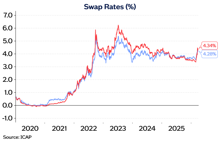 “The vast majority of existing mortgage holders are protected from the immediate impact of higher interest rates, with c90% on fixed rate mortgages. Also, while swap rates have risen markedly, to date the increase is much less pronounced than that seen in the aftermath of the pandemic. Indeed, they are still at levels prevailing in late 2023 / early 2024 (as shown in the swap rate chart above).