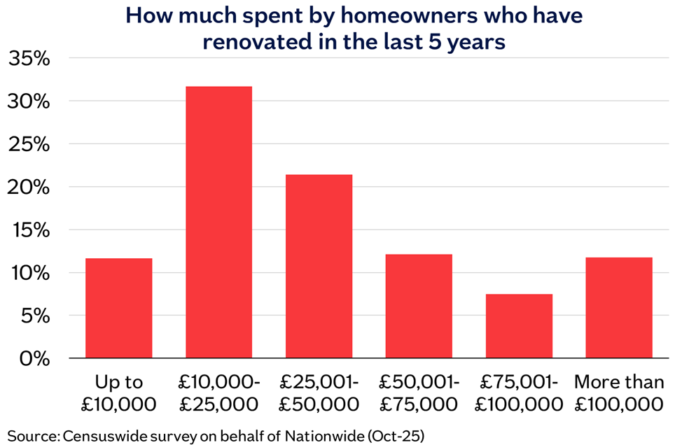 “Across all homeowners making renovations in the last five years, the average spend was around £52,000, although there was significant variation (as shown on the chart below), reflecting the range of work completed. Younger households (aged 25-34) tended to have a much higher average spend (c£97,000), reflecting that this group are more likely to have made more substantial improvements. Amongst older age groups, average spending was lower, with only a small proportion (c10%) of homeowners completing a major project such as an extension in the last five years.