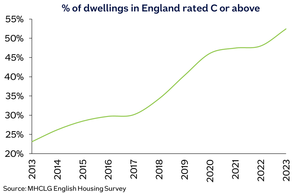 “Over the past ten years, energy efficiency has improved across the housing stock thanks to the higher efficiency ratings of newly built properties and improvements carried out on many existing homes, such as loft and cavity wall insulation. The latest data (2023) shows that over half (52%) of the housing stock is now rated ‘C’ or higher, up from less than a quarter (23%) in 2013.