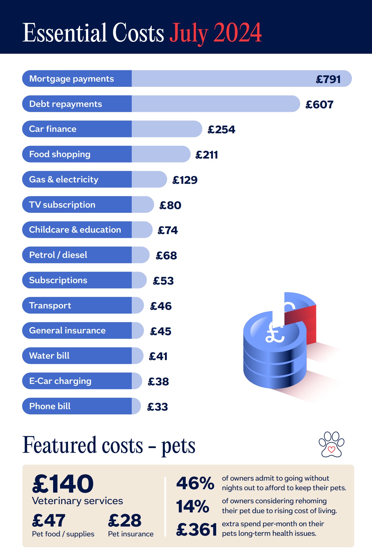 Separate Nationwide research4 of 1,000 pet owners showed the average person spends £126 per month2 on everything from food and treats to bedding and insurance. However, there are a range of additional costs which can sharply increase the cost, including dealing with long-term health issues (£361) or injuries (£338), pet trainer (£264), dental care (£262), dogwalker (£248), home repairs (£247), kennels (£245), grooming (£140) and vet bills (also £140).