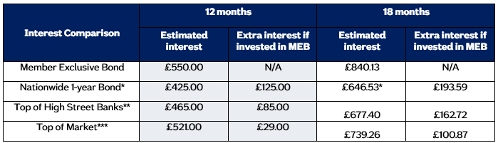 2 The table below shows the additional interest members could earn by savings in the Member Exclusive Bond (MEB) at 5.5%. Calculations of the estimated interest assume £10,000 is deposited on day one of account opening. This interest is paid gross and may be subject to tax depending on individual circumstances.