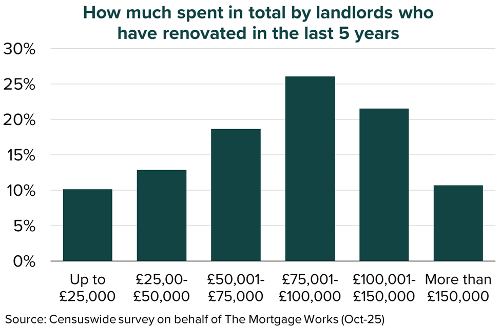 “Across all landlords making renovations in the last five years, the average spend was around £88,000 in total, although there was significant variation, which reflects the mixture of work undertaken and portfolio size. Taking account the number of properties renovated, this works out around £43,000 per property.